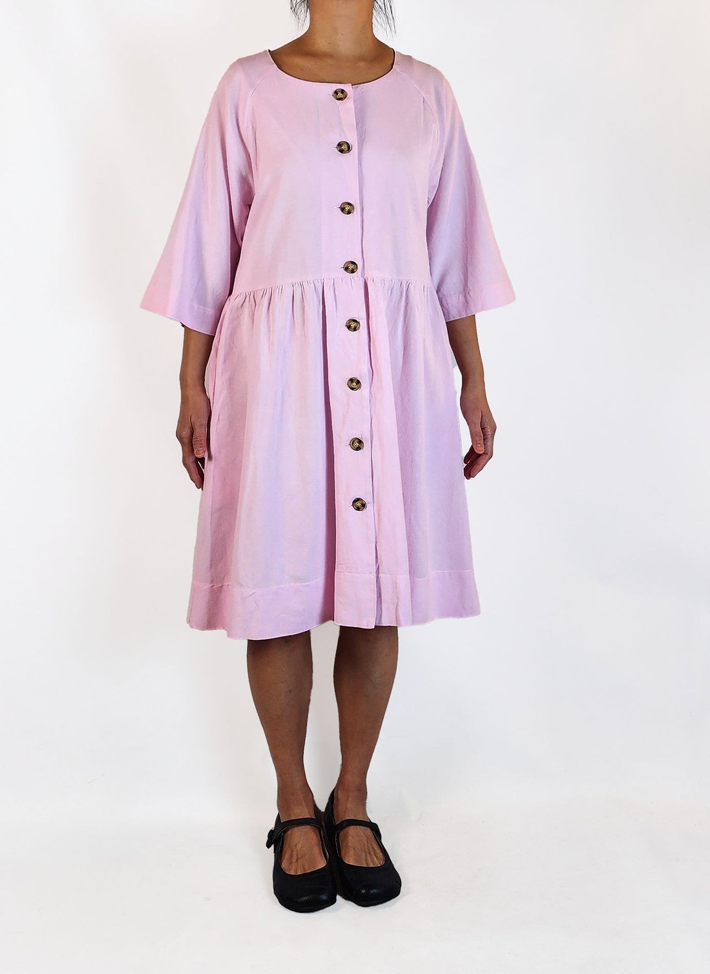 This adorable second-hand dress by Australian designer Elm features a light, pretty pink fabric with cute contrasting brown buttons down the front. It has lovely deep pockets and an easy breezy fit that makes it perfect for transitional seasons and summer for the sun conscious! This dress combines comfort and style effortlessly. A charming piece that adds a playful touch to your collection!
