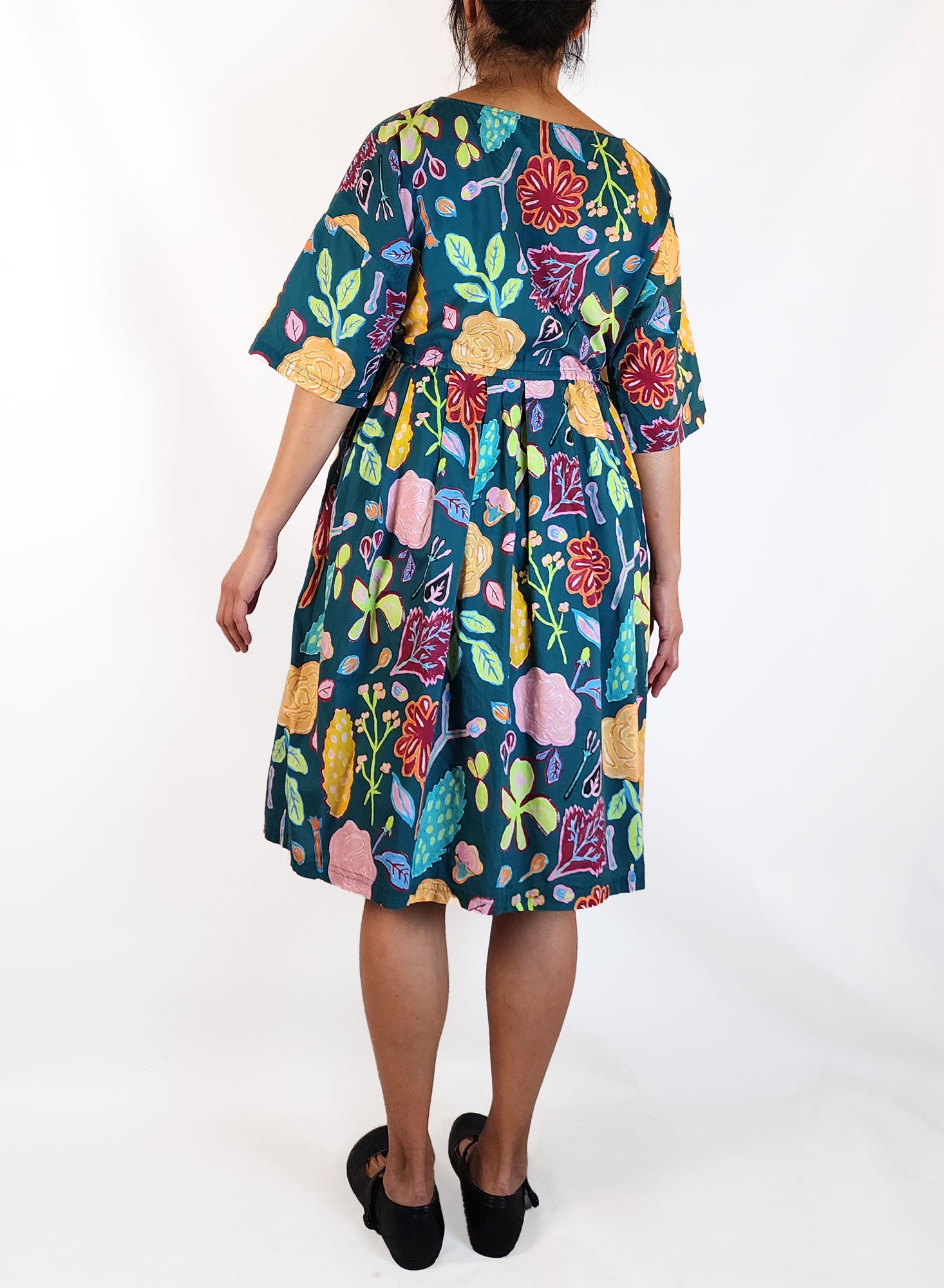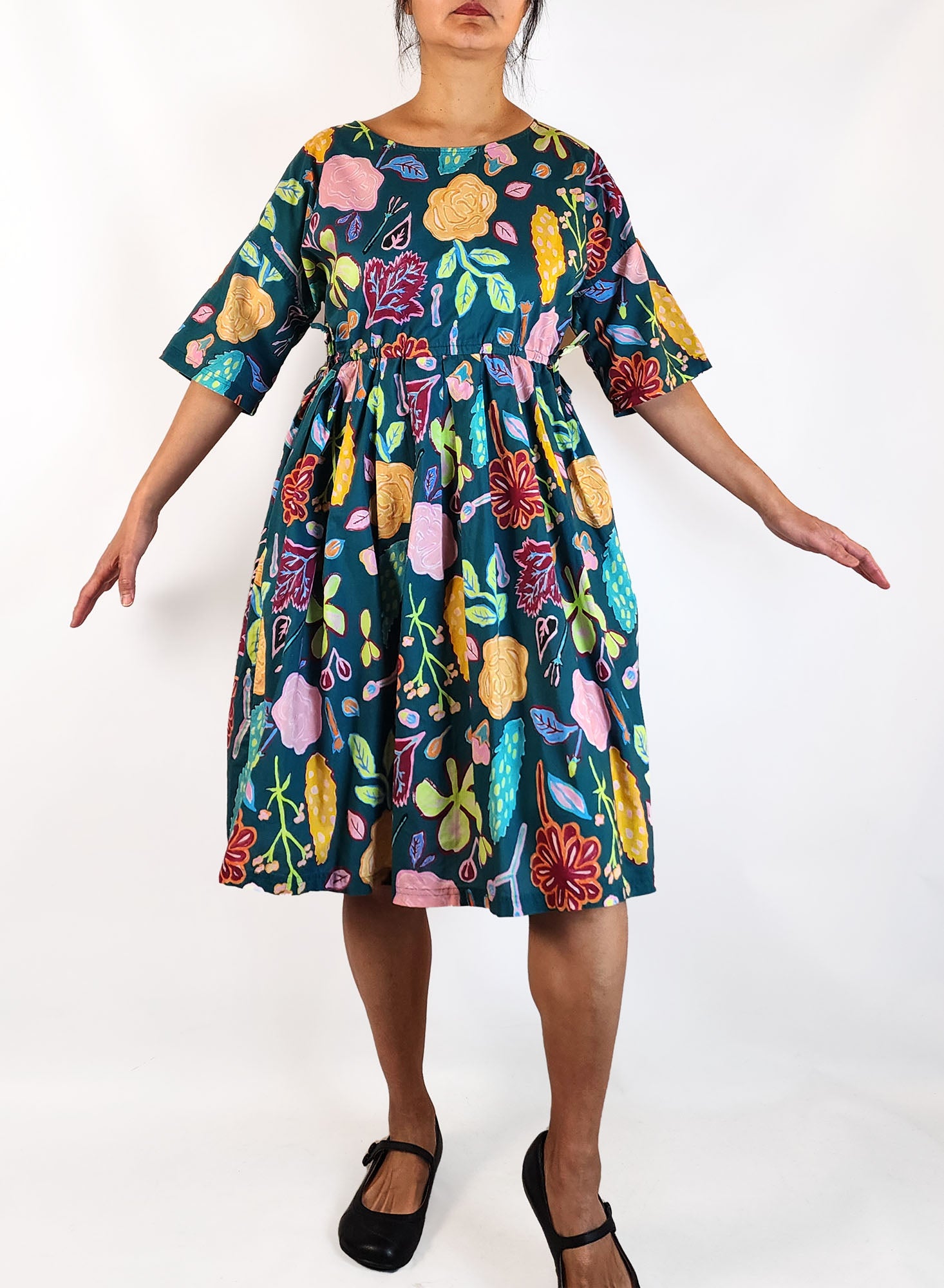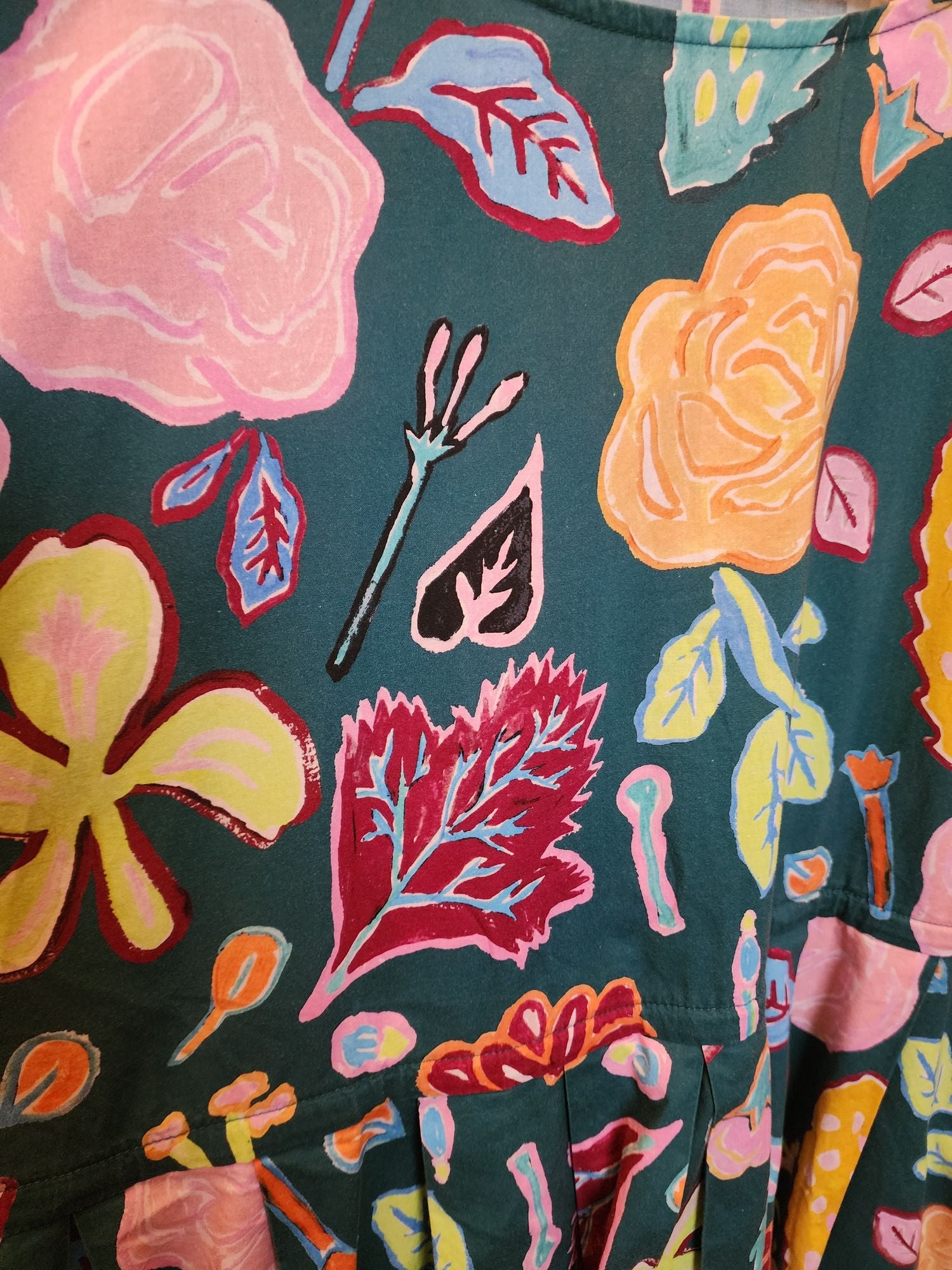 This stunning second-hand dress by Australian designer Gorman features a beautiful forest green background with pretty and colourful flowers! It has deep pockets, an adjustable drawstring waist, and half-length sleeves for a flattering fit. Perfect for work or play across transitional seasons and summer, this lovely piece brings fun and function together. Enjoy the comfort and charm of this unique floral dress!