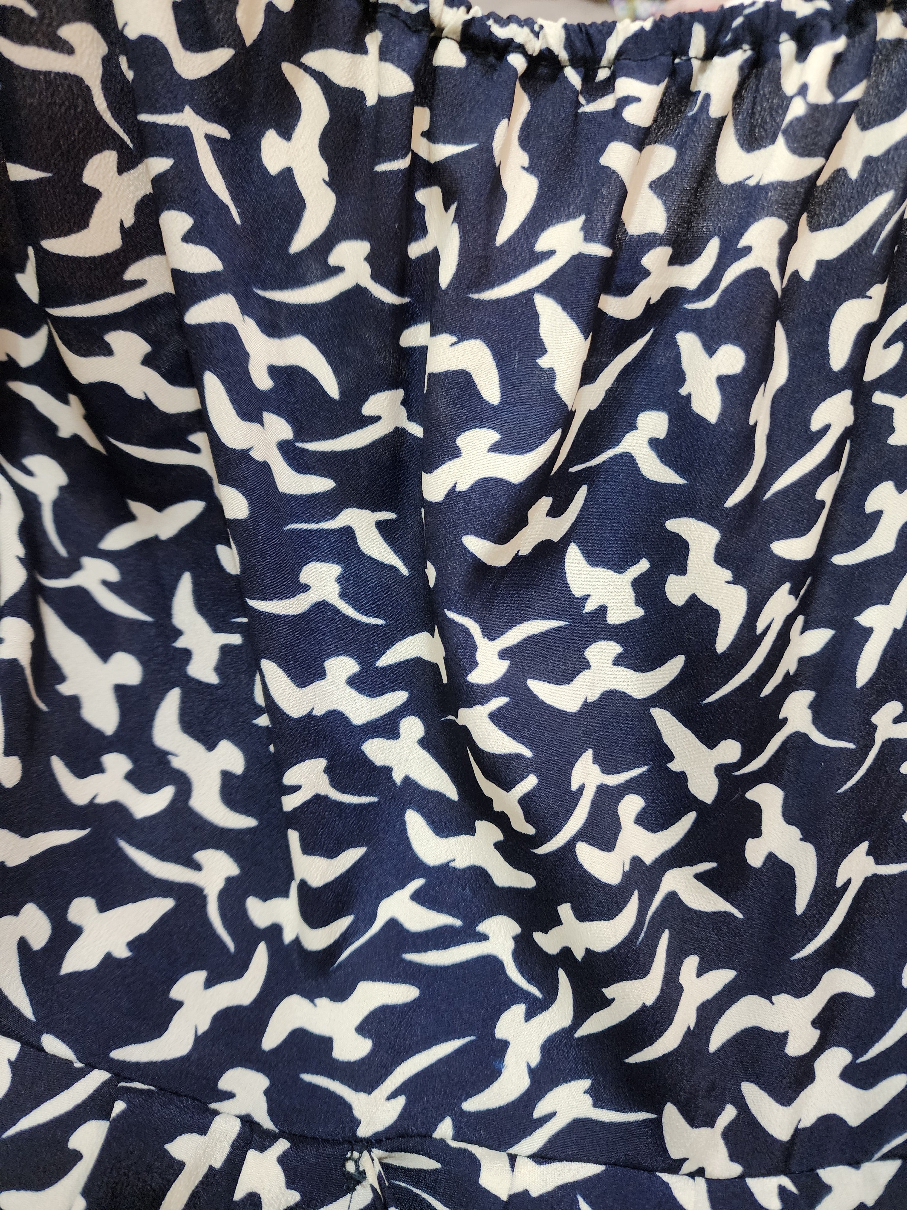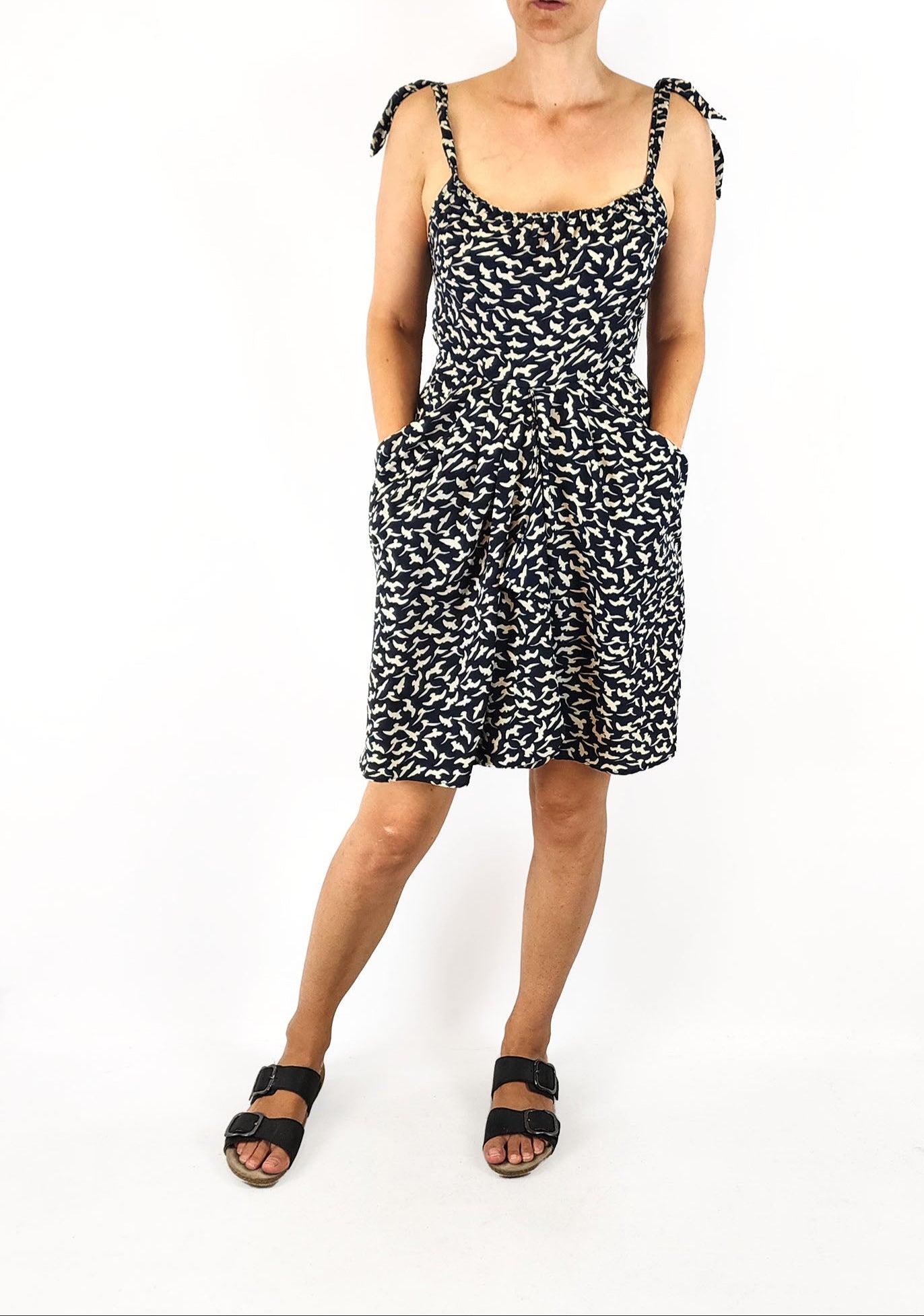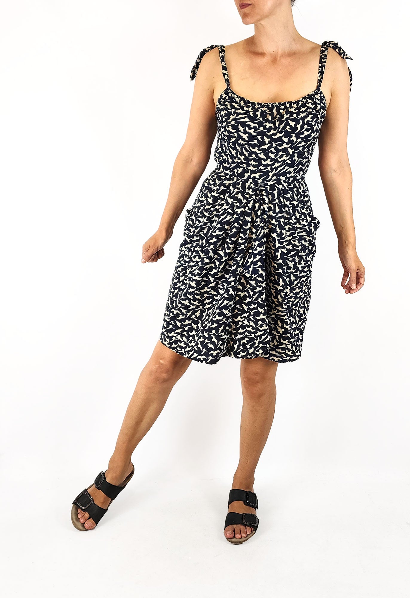 This cute second-hand dress by New Zealand designer Karen Walker features a neutral navy base with a beautiful bird print. It has large deep pockets, fluttering front pleating, adjustable spaghetti straps, and a flattering fit. Perfect for spring, summer, and early autumn! Layer it with a t-shirt underneath and dress it up with some heels.