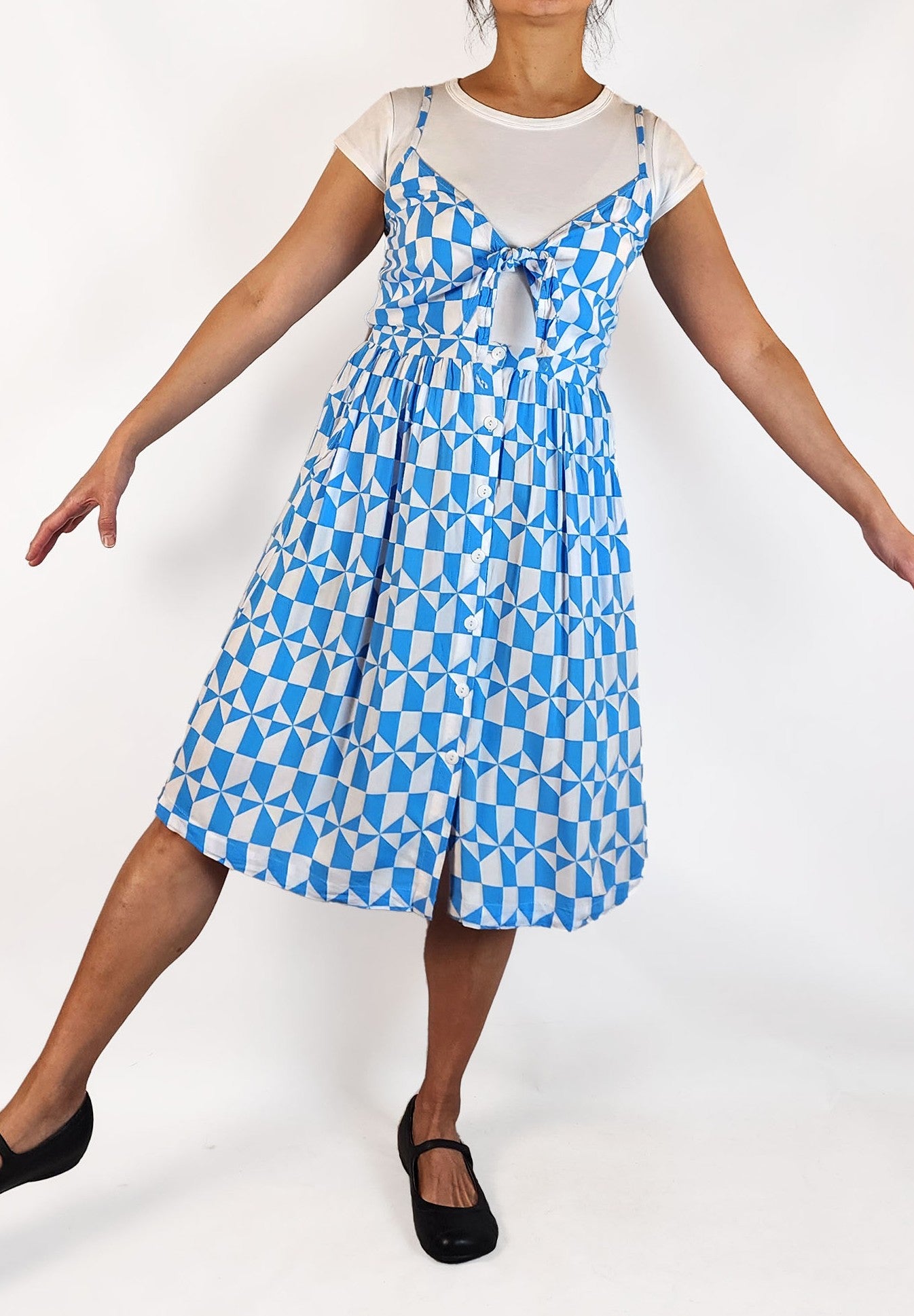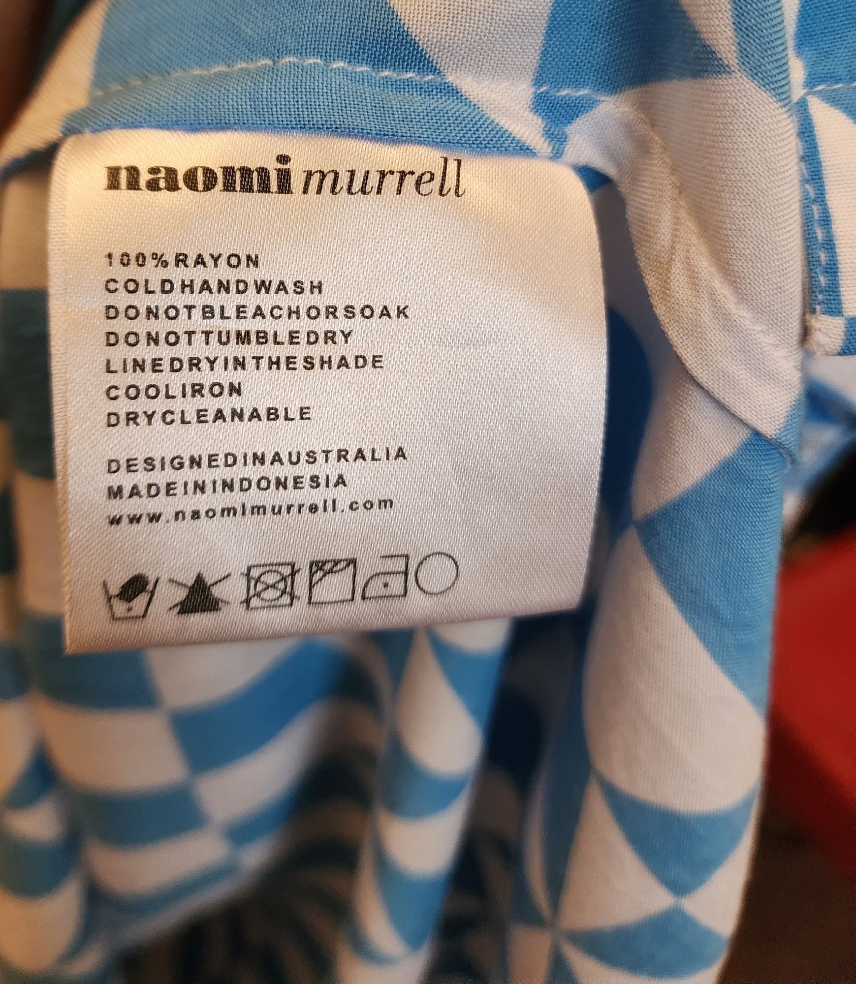 This gorgeous second-hand dress by Australian designer Naomi Morel features a pretty blue and white diamond pattern that is sure to catch the eye! It has delicate spaghetti straps with buttons running down the length, plus a lovely tie around the bust for a flattering fit. There s even a cute peekaboo hole detail that can be worn as is or layered over a t-shirt for a playful look. Lightweight and comfortable, it s perfect for adding some fun to your outfit!