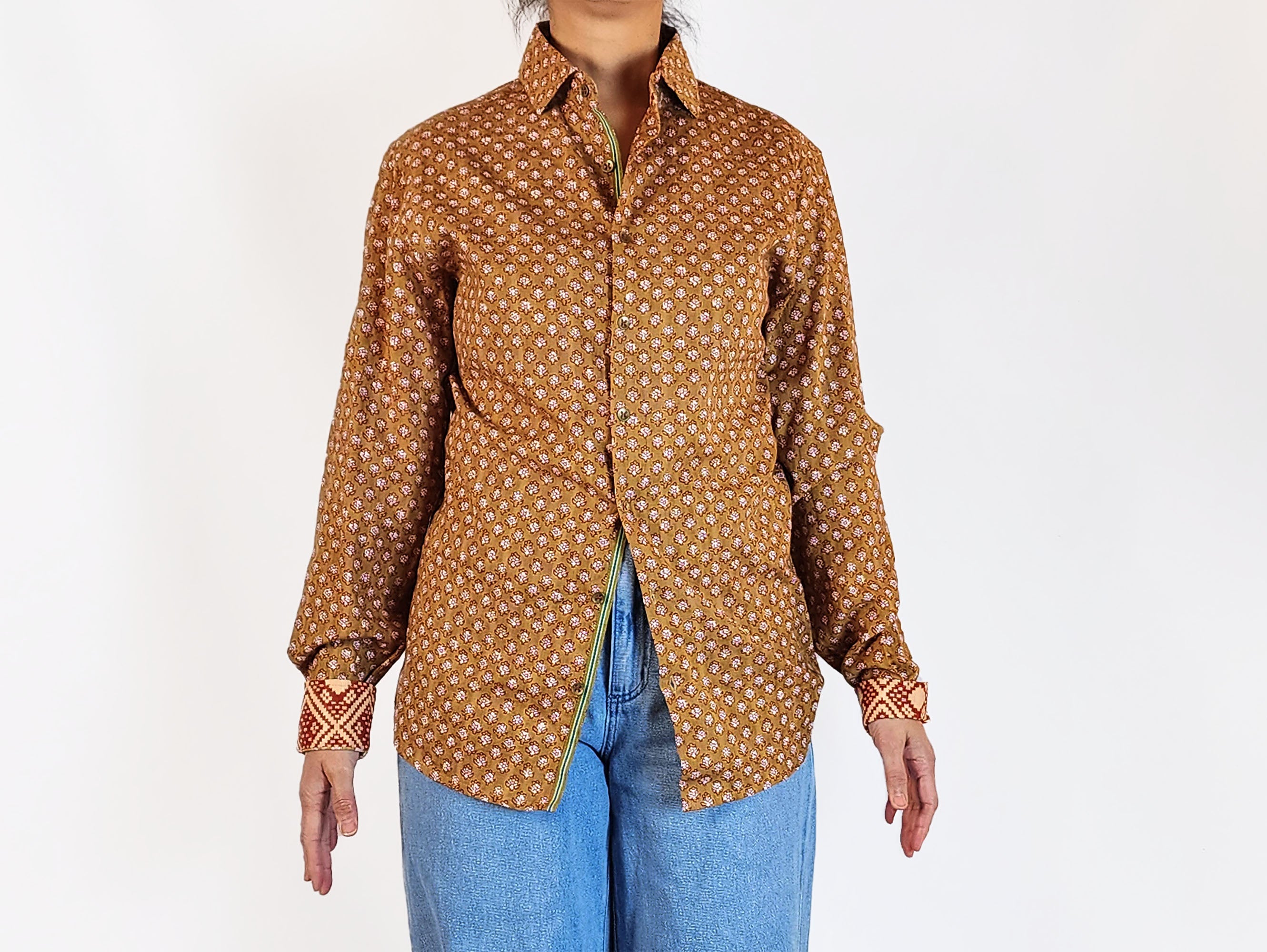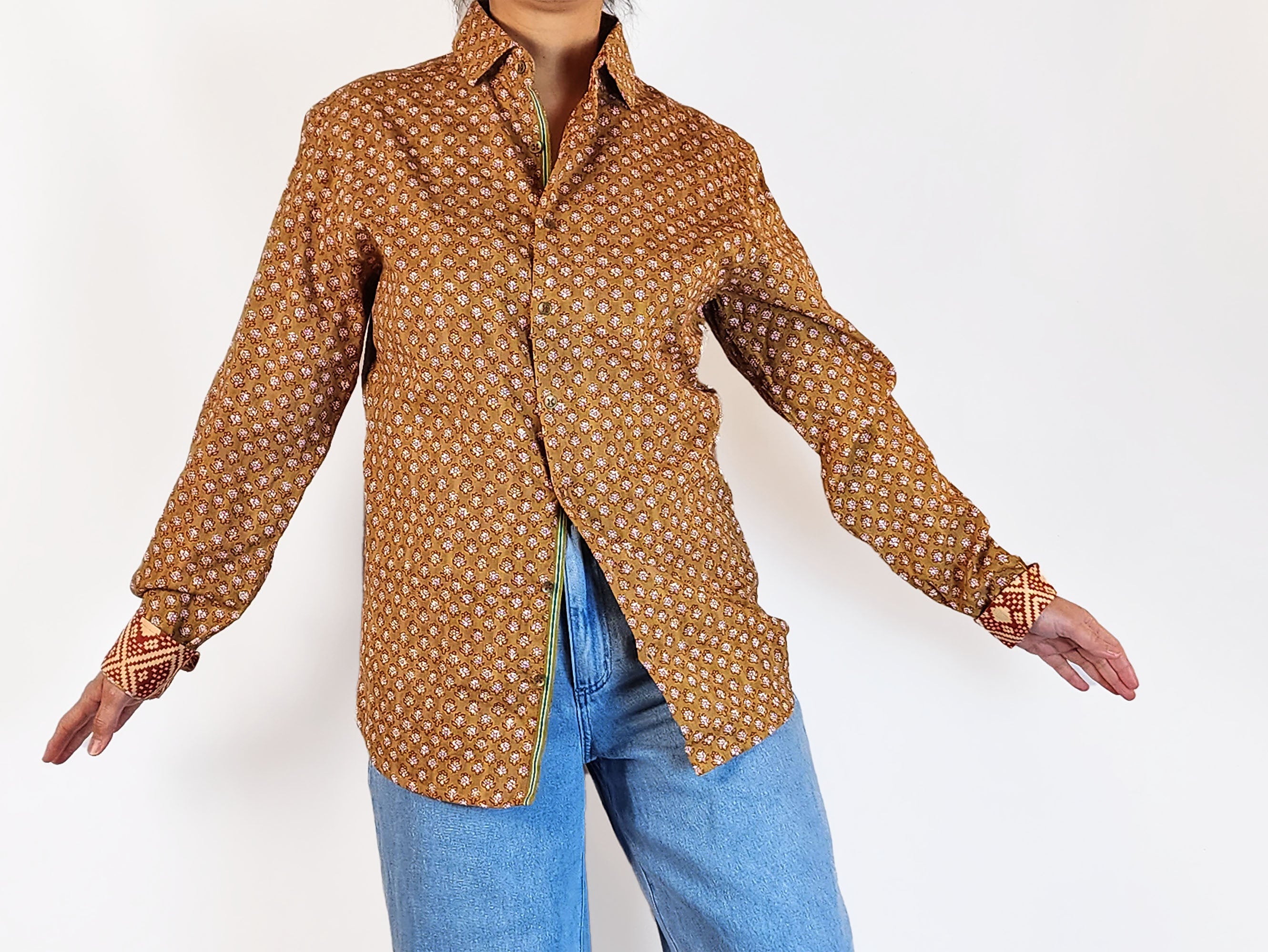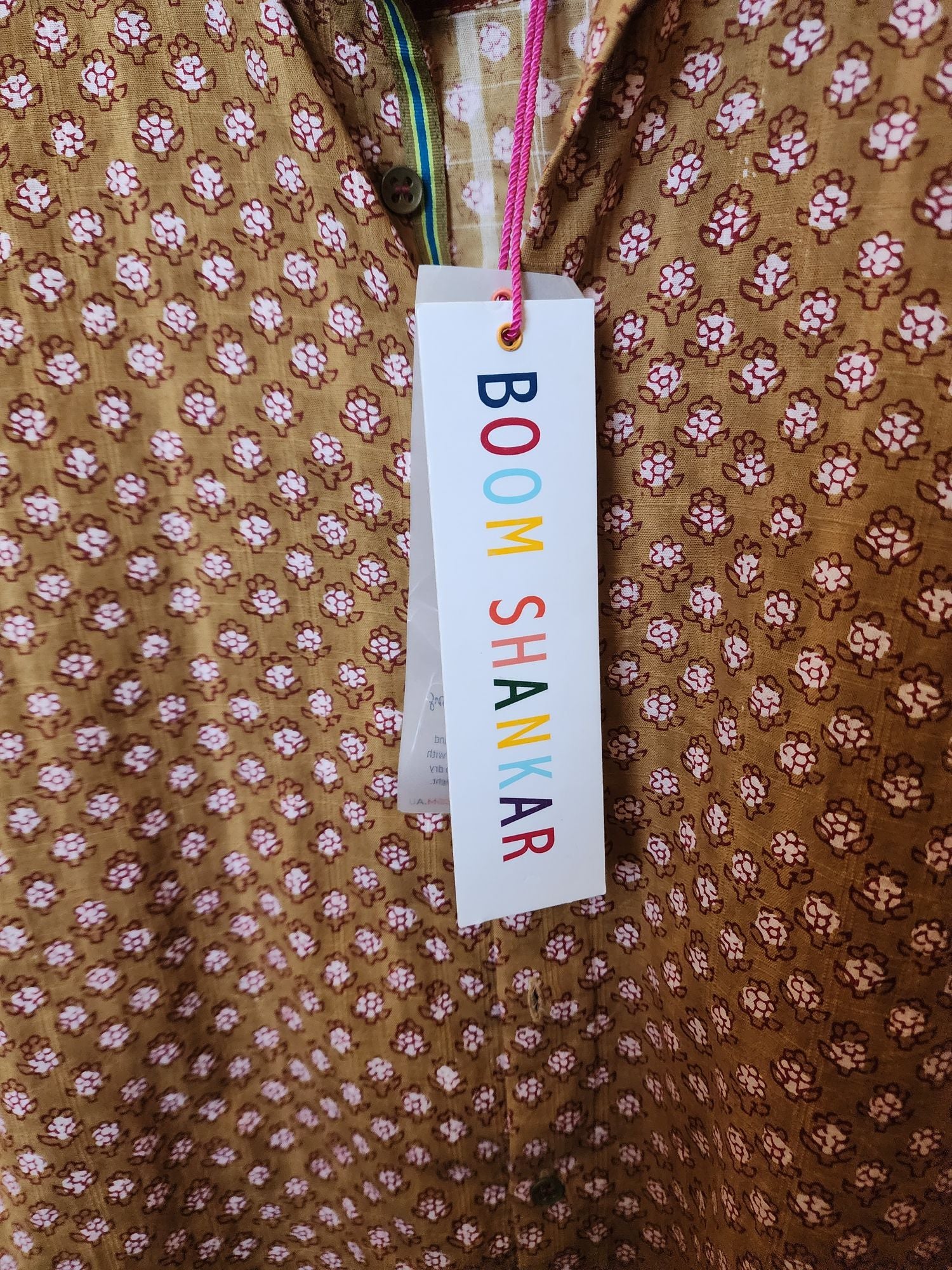 This lovely second-hand top by Australian designer Boom Shankar features a gorgeous mustard-based print with pretty pink and red flowers! It has long sleeves, a classic shirt style with front buttons and a collar. This piece is unique and fun, perfect for work or play across seasons! A charming addition to your collection that brings color and comfort.