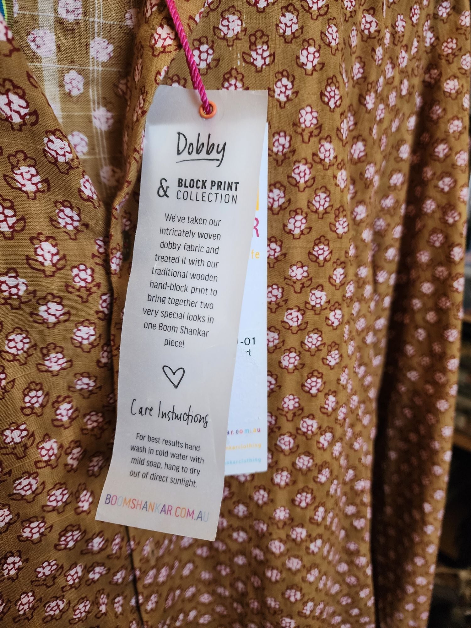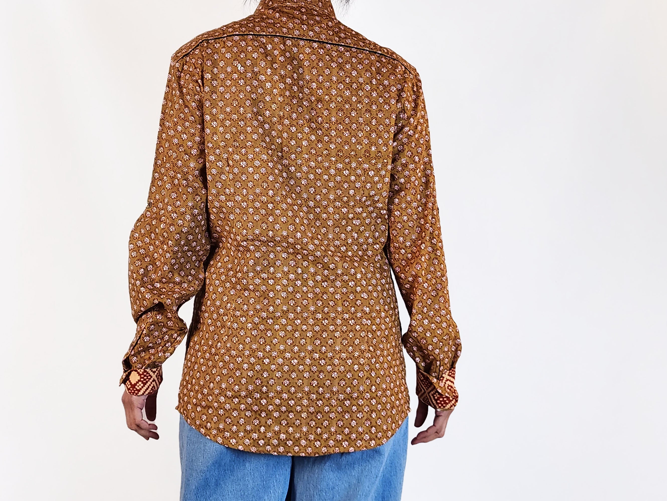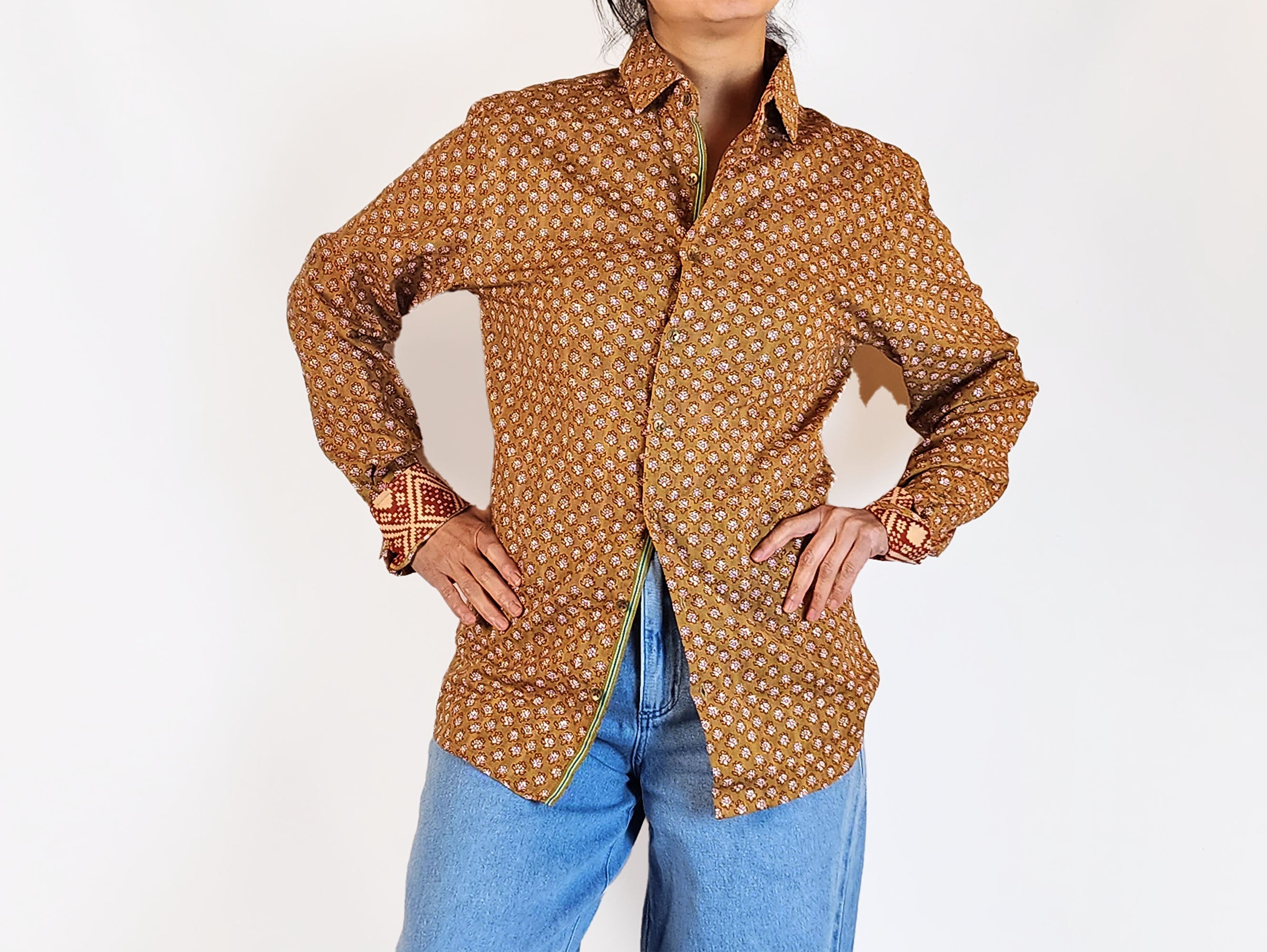 This lovely second-hand top by Australian designer Boom Shankar features a gorgeous mustard-based print with pretty pink and red flowers! It has long sleeves, a classic shirt style with front buttons and a collar. This piece is unique and fun, perfect for work or play across seasons! A charming addition to your collection that brings color and comfort.
