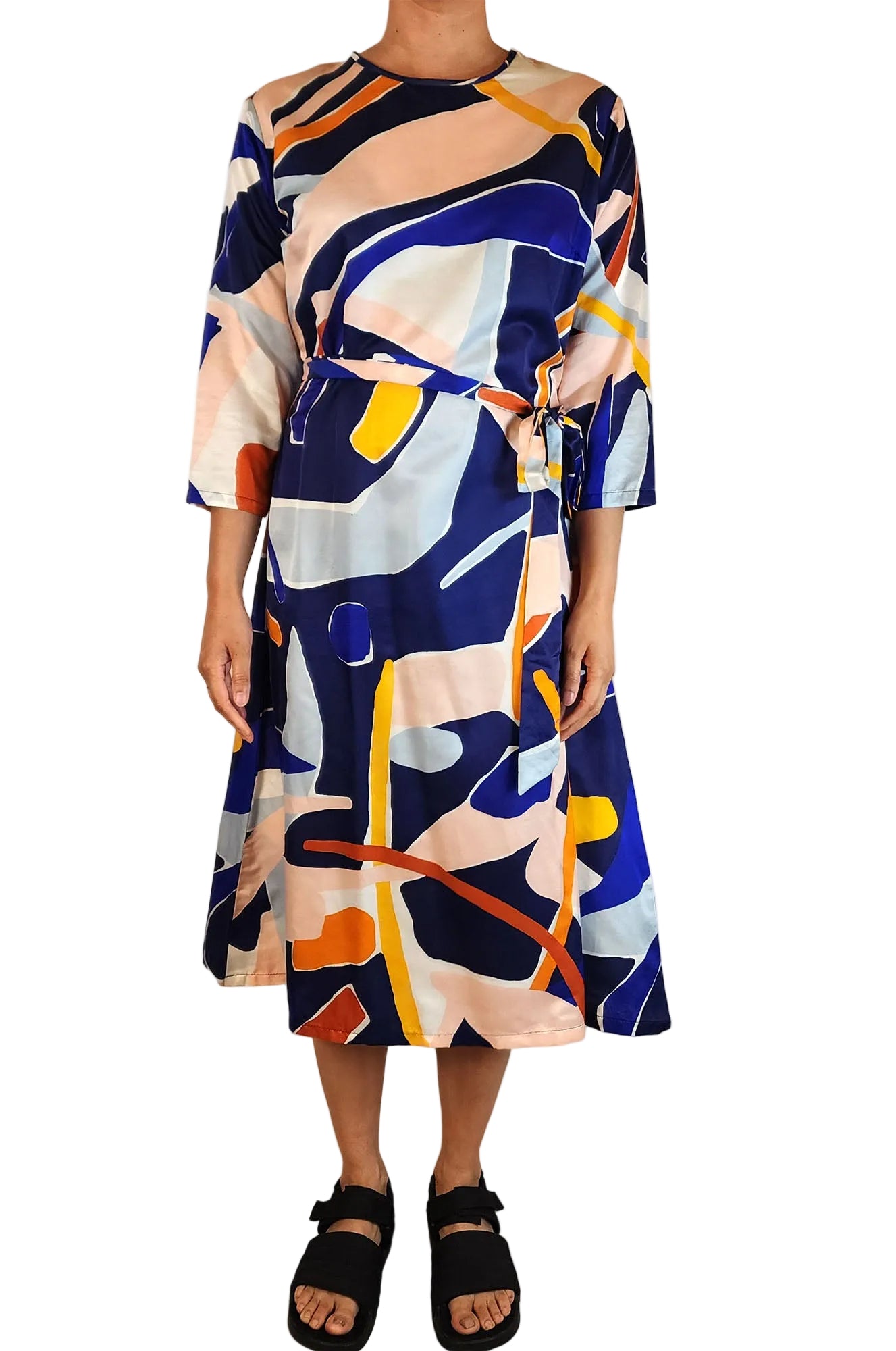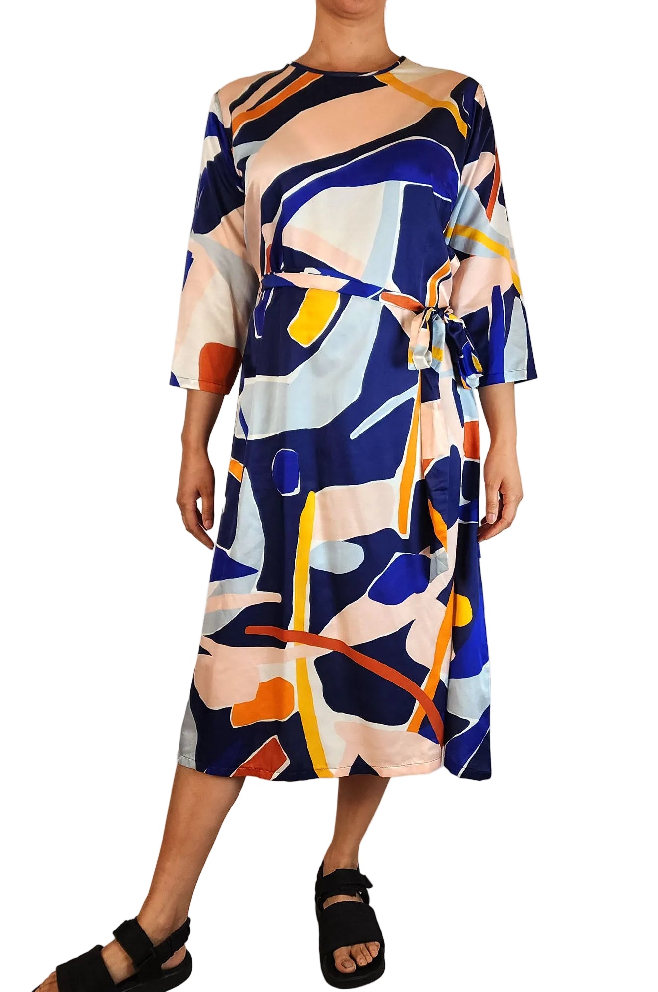 This fabulous second-hand dress by Australian designer Variety Hour features one of their signature beautiful prints and long sleeves. It includes an optional waist tie for a flattering fit that s perfect for work or play. The dress is ideal for transitional seasons and winter alike, offering versatility and charm. Weighing 400 grams, it s a lovely piece with a small mark on the shoulder that hardly detracts from its near excellent condition. A great addition for those who love unique prints and comfortable style!