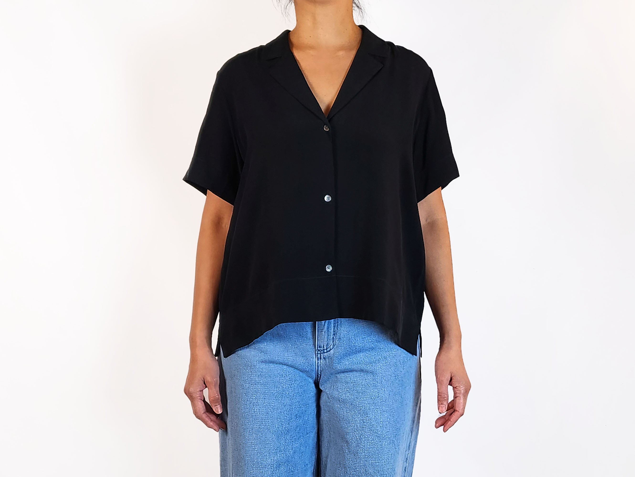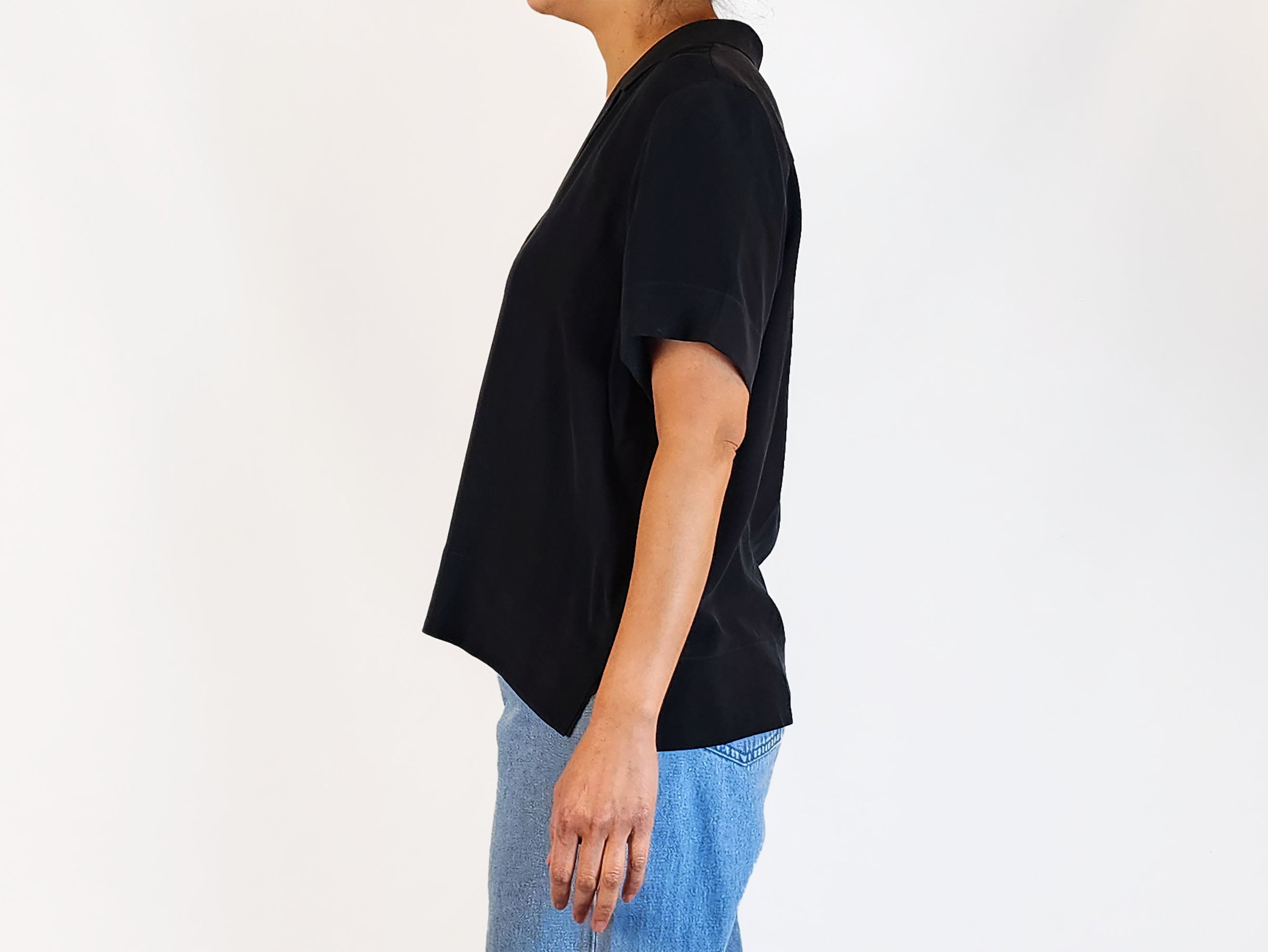 This stunning second-hand top by fabulous designer Everlane features beautiful high quality 100% silk black fabric. It has elegant front buttons, short sleeves, and a well-tailored collar that adds a refined touch. Perfect for work or play during spring and summer, this top combines comfort with a polished look. Its lightweight feel makes it a great choice for warmer days!