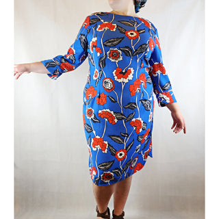 What a fun and funky piece! Featuring a retro inspired print on vibrant blue base, 3/4 length sleeves, pockets and a hidden back zip, this little number is fabulous and easy wearing together! Wear as is or layer with tights and a jacket in cooler weather!