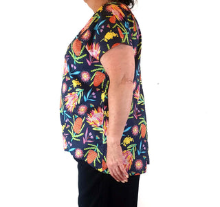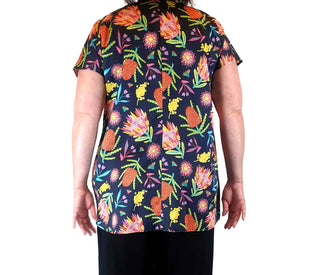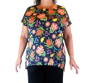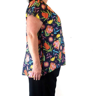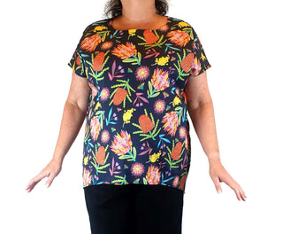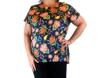 This pretty piece is handmade and features stunning protea and native Australian flower print, cap length sleeves and an easy fit! Wear this cutie to work or play and layer in cooler weather!