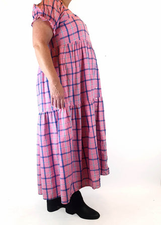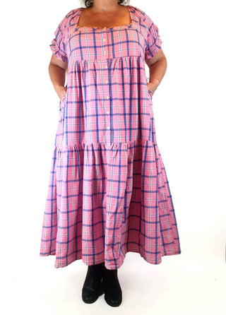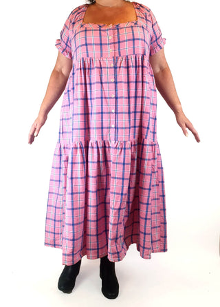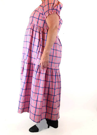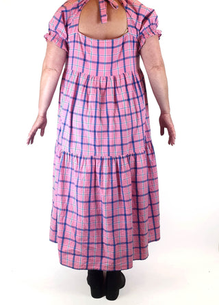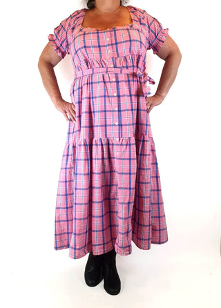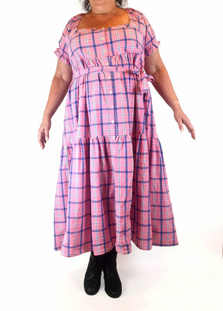 What a gorgeous piece! Featuring gorgeous pink check print 100% cotton fabric, half length sleeves, maxi length, side pockets and an optional waist tie, this stunner is fabulous and comfortable together!
