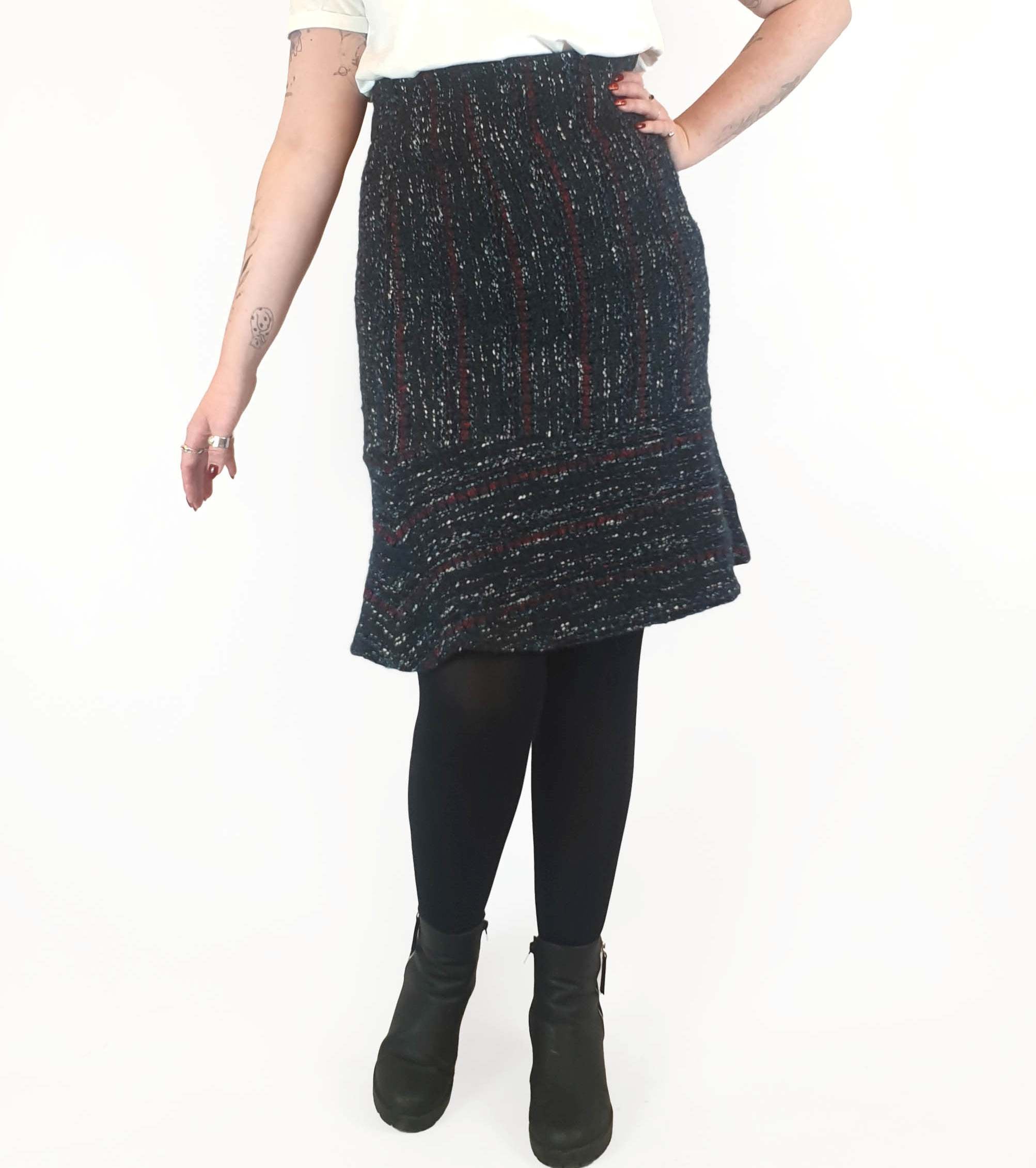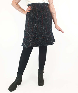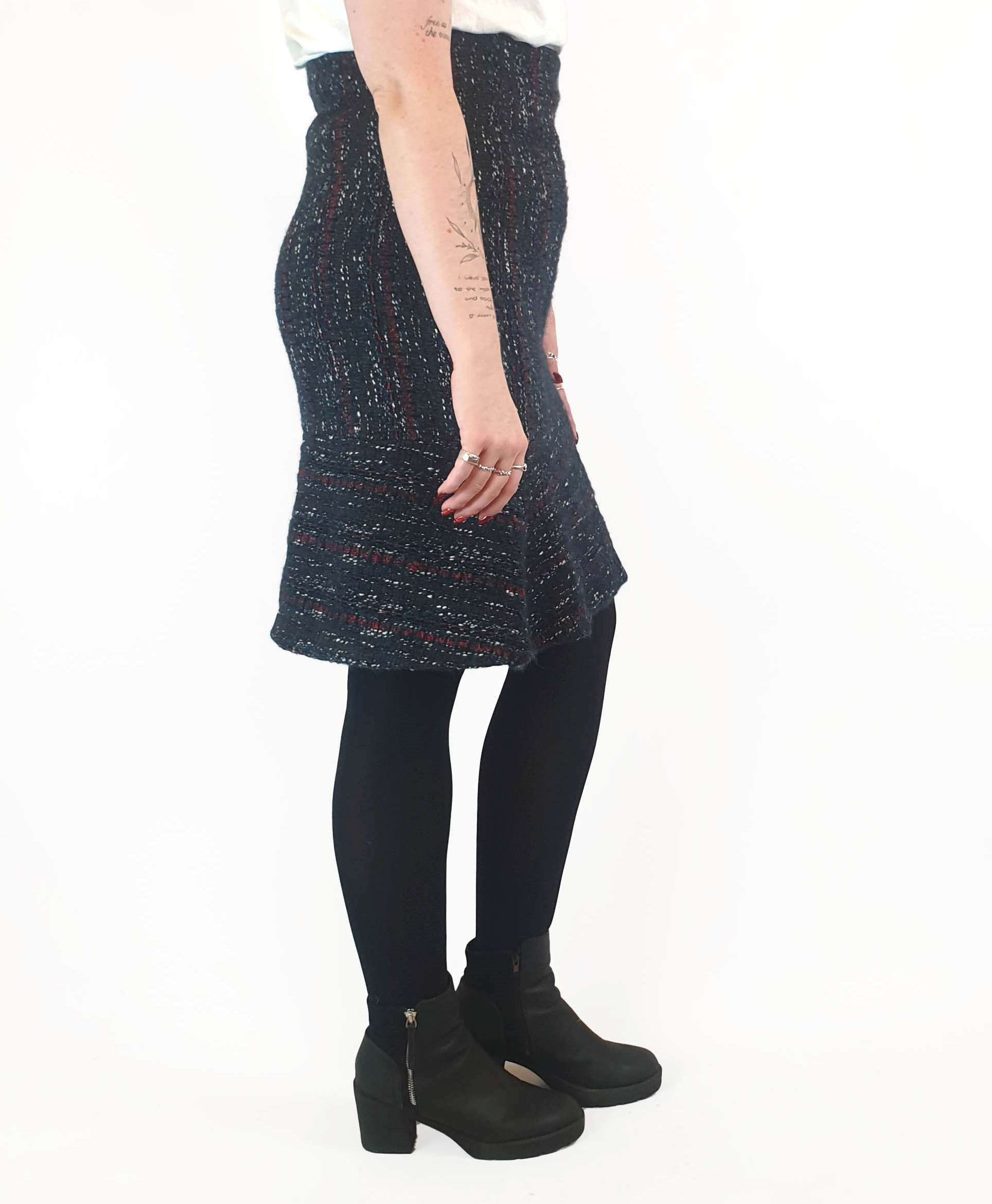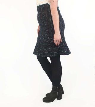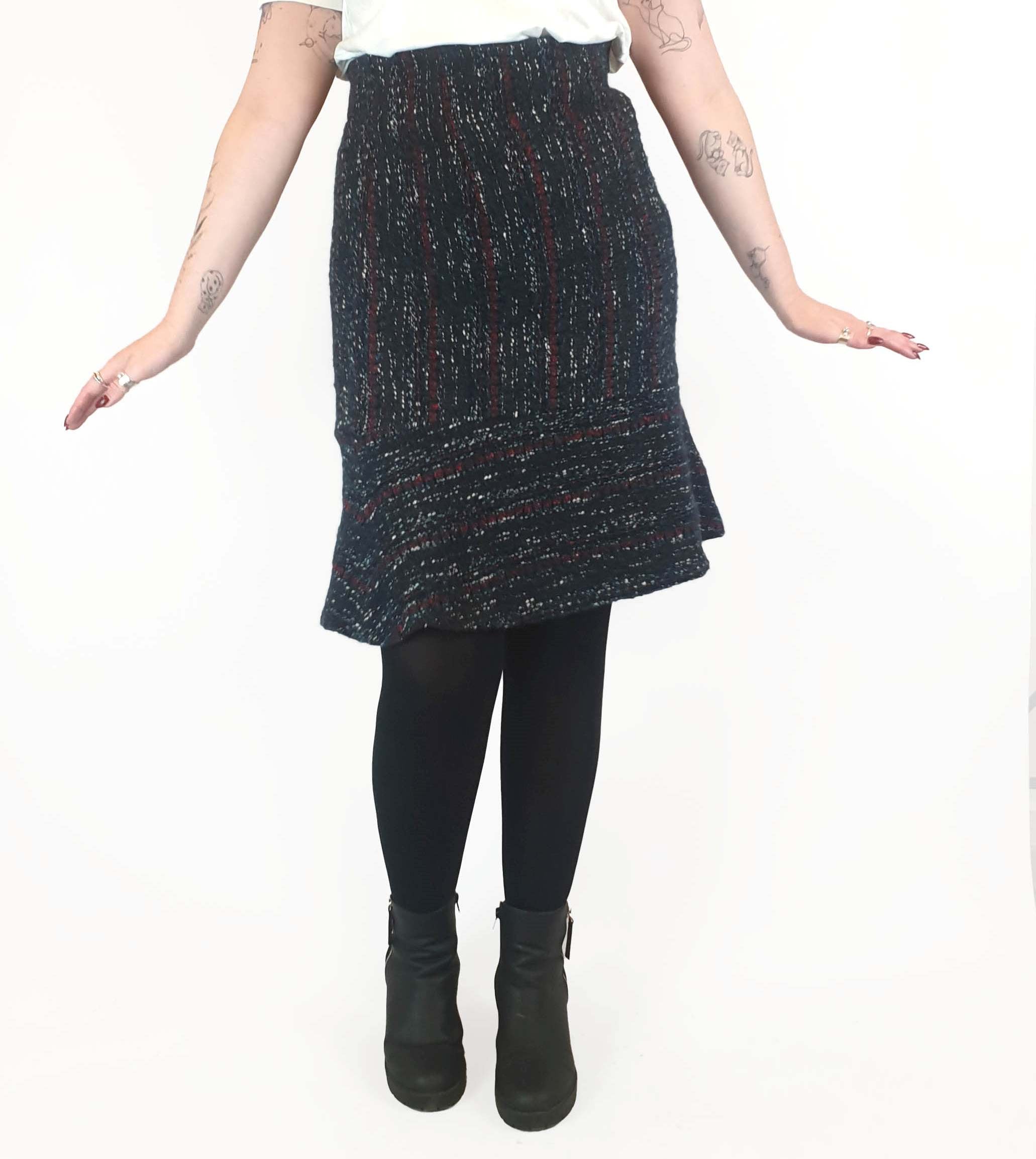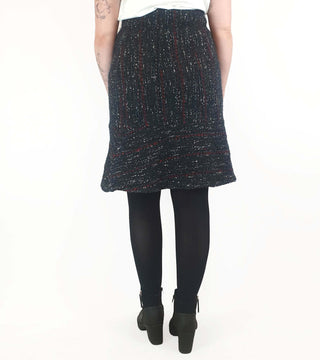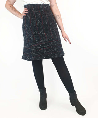 Such a lovely piece! Featuring stunning wool mix fabric with blue, red and white flecks, a flattering bell shape, hidden side zip and full slip, this is a lovely piece that's ideal for work or play across winter and transitional seasons!